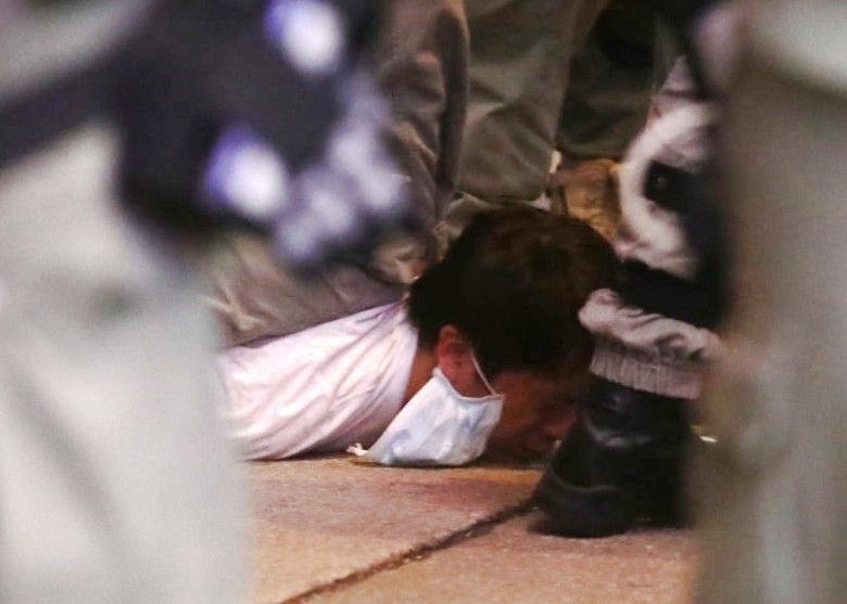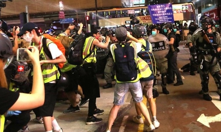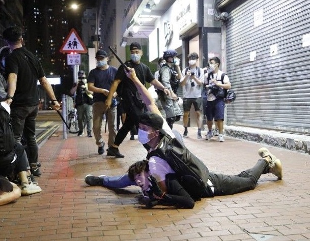 警方一度舉起藍旗警告,指在場人士正參與非法集結,制服多人。一名防暴警用警棍掃向鄺俊宇腹部,鄺俊宇倒地,隨即有兩至三名防暴警衝前包圍,其中一人以膝頭按在鄺俊宇頭部。