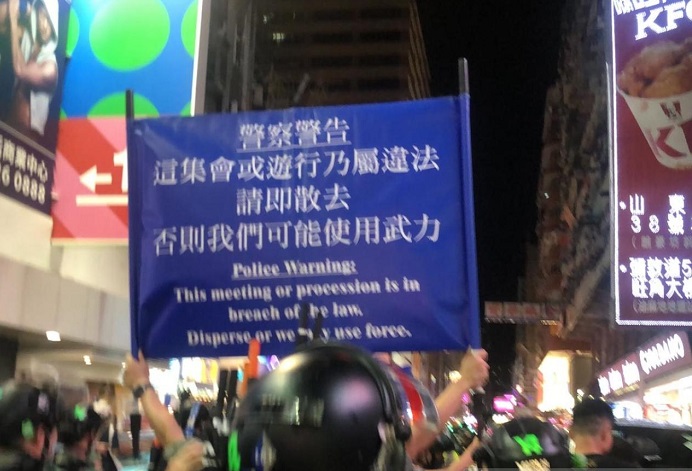 晚上約8時,防暴警舉起藍旗,警告在場聚市民散去。未幾,防暴警衝出封鎖線驅散在場人士,在西洋菜南街百老匯戲院外截獲多人,並向部分人發出違反禁聚令的定額罰款告票。至晚上8時30分,防暴警再舉藍旗警告在場聚集人士,警方同時於彌敦道布防。