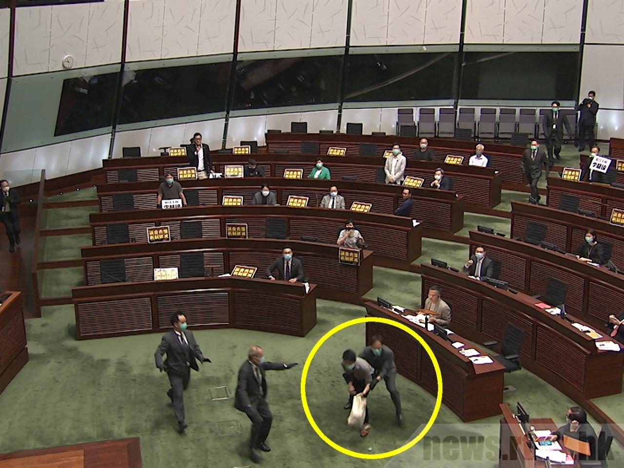 立法會會議期間,民主黨議員許智峯手持一袋腐爛植物,走近主席台,被保安攔截,該棵腐爛植物倒瀉在地,立法會暫停會議,立法會秘書處報警,警員及消防員到場。