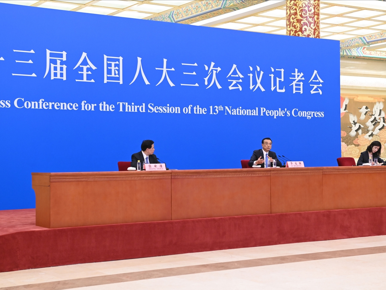 因应新型肺炎疫情,李克强在人民大会堂金色大厅出席记者会,所有记者则在梅地亚新闻中心透过视象系统提问。