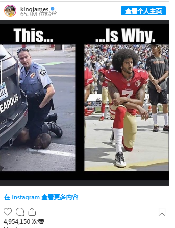 詹姆斯在社群網站Instagram上,把白人警察用膝蓋壓制佛洛伊德的照片,與前職業美式足球聯盟(NFL)球員卡珀尼克(Colin Kaepernick)2016年單膝跪地抗議的照片互為對比。