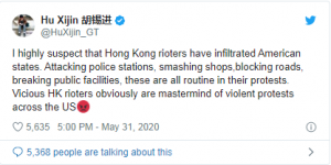 环时除了在微博上用中文发布相关评论外,其总编辑胡锡进周日 (5月31日) 在推特上发文表示,他高度怀疑香港示威者已“渗透美国各州”,强调美国示威行动中出现的一些暴力行为,与去年香港“反送中”示威中所出现的情况非常类似。他写道:“邪恶的香港‘暴徒’很显然是美国示威行动的幕后主使者。”