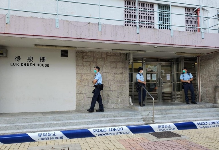 有保安及警員在祿泉樓附近戒備,並在多處拉起封鎖線,附近停泊數輛旅遊巴。