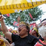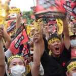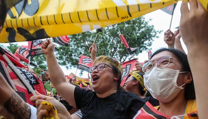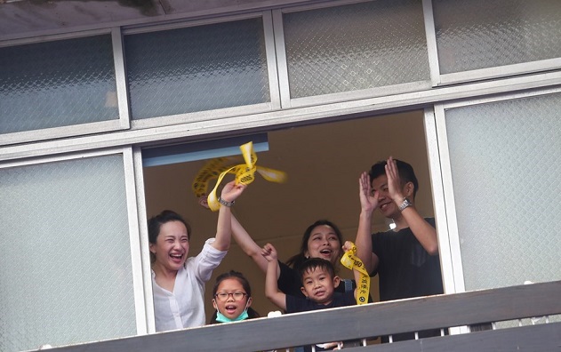 高雄市長韓國瑜罷免案6日投開票,傍晚5時許確定罷免成功,罷韓支持者獲知結果底定後,開心揮舞黃絲帶並歡呼