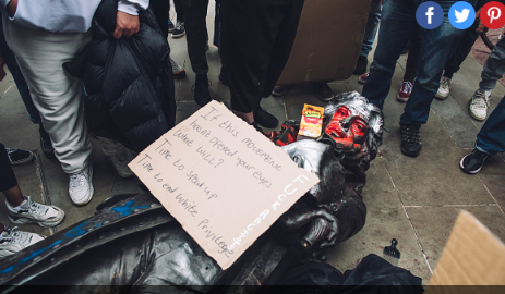 「布里斯托奴隸貿易商愛德華.科斯頓的雕像被拆除、毀壞並扔入河中。#黑人的命也是命(BlackLivesMatter)」