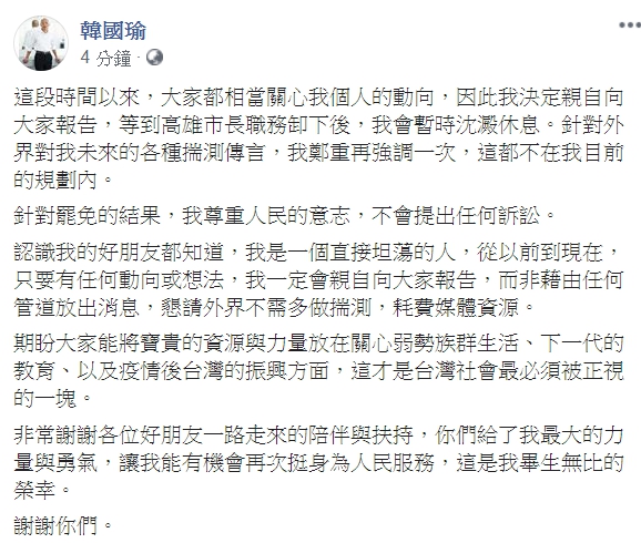 韓國瑜又說,等到卸下高雄市長職務後,會暫時沉澱休息,外界對他未來的各種揣測及傳言,他鄭重強調都不在目前的規劃內。韓國瑜說有任何動向或想法,一定親自報告,而不是藉任何管道放出消息,希望外界不需多做揣測。