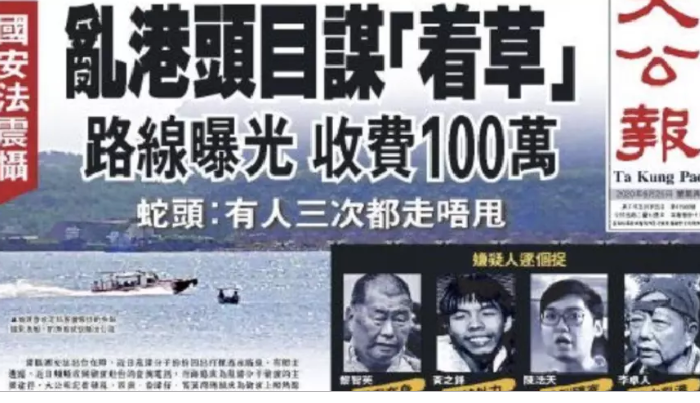 大公报周四的头版报道,以“嫌疑人逐个捉”刊出4名泛民政治人物照片,包括黎智英、香港众志秘书长黄之锋、支联会主席李卓人及前香港民族党召集人陈浩天,指他们打算逃亡。“报道”引述所谓“消息人士”,称黎智英打算逃亡“昭然若揭”,指“即使重金畀千万偷渡费,都没有蛇头做到他的生意”。文汇报亦有转载大公报的“报道”。