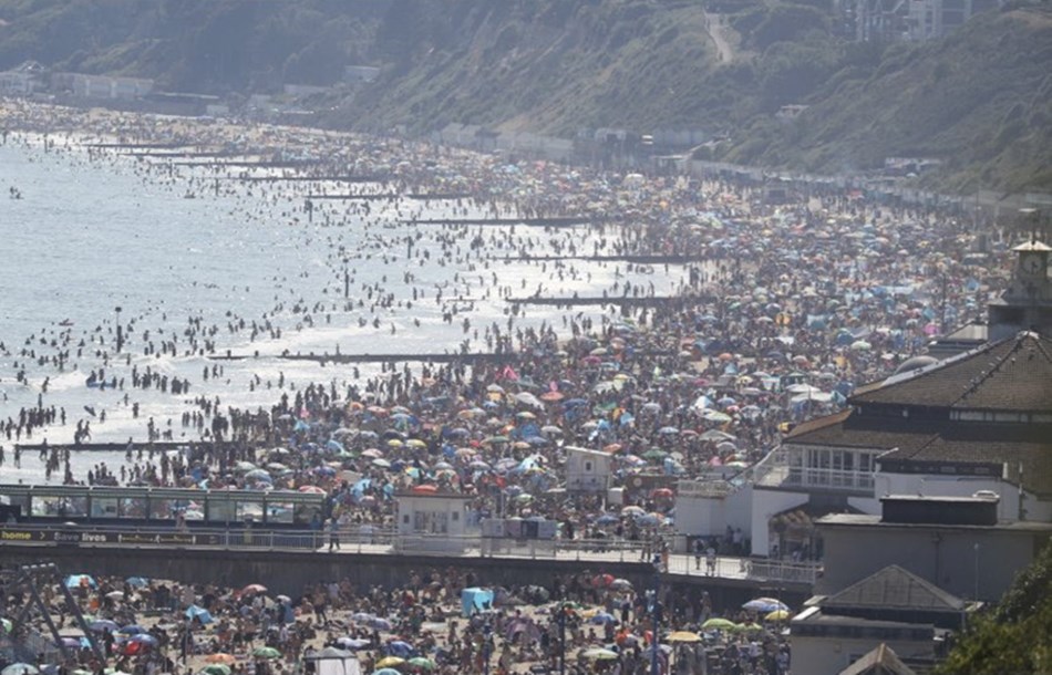 數以千計英國民眾不顧疫情威脅,在今年以來最熱的一天湧入英格蘭南部海濱城市波茅斯(Bournemouth)的海灘,當局25日宣告構成「重大事件」,成千上萬人湧入海灘場面令當局感到「驚恐」。