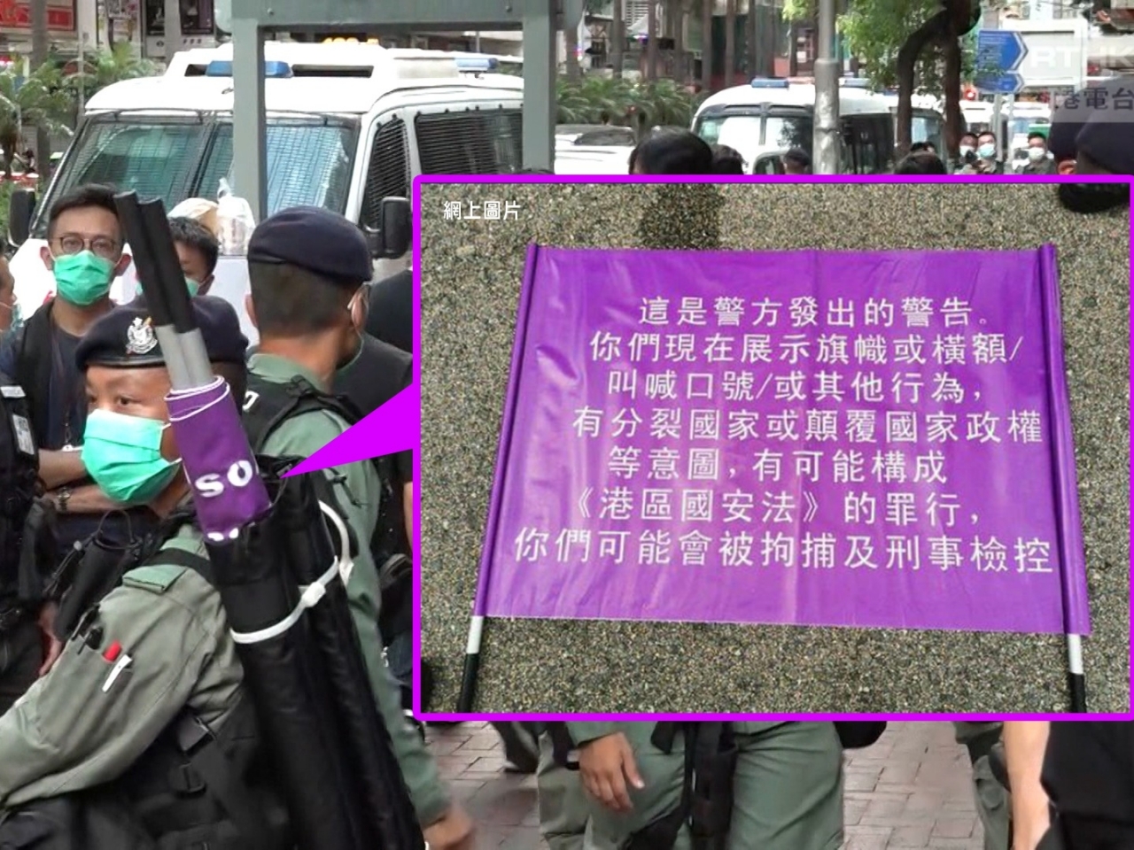 引述警方消息称,国安法生效后警方已设立专责部门办理国安犯罪案件,市民若在集会游行中举港独旗、香港蓝白旗、叫“香港独立 唯一出路”、“香港人建国”等口号,或者煽动台独、藏独、疆独等,皆属违法。警方会在现场录影及搜证,可行情况下会作出警告,警方也可以作即时拘捕,而拘捕前不一定需要预先作出任何警告。
