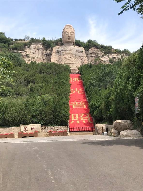 在此次入晋之前,我并不知道除了新昌大佛、乐山大佛之外,还有蒙山大佛之说。其实,新昌大佛是尊室内佛像,乐山大佛则与蒙山大佛一样,都是倚山人工凿刻而成。尽管就高度而言,前者稍高出几米,可从厚实等体量上来看,后者则略胜一筹,更当得起“山是一座佛,佛是一座山”之说。就二者遭遇而言,蒙山大佛经历的坎坷更多。它自北齐天保年间开凿后,却在元末遭遇被毁整体也被泥土覆盖的厄运,直到上世纪八十年代,才被当地居民无意中发现。发现之始,佛首就已不在了。自佛像被发现以来,国家和当地政府非常重视它的修缮和保护,不仅在专家精心考证计算设计指导下,又重新雕刻了一个佛首安装在佛身上,而且还大力推进周边的环境建设,完善交通等配套设施。经多年努力,景区已开发得十分成熟了。我们此次是飞机自太原机场一降落,便驱车直奔蒙山景区。在经登上60多级台阶来到第一个平台时,便见上面大佛佛座那平台,沿着山坡铺就而下的一写有“佛光普照”四个大字的条幅。又攀登了170多级台阶,才来到了大佛佛座那平台。此时近距离观摩,可很清晰地看到佛身上有许多酒盏大小的窟窿,佛身与佛首色泽上有着明显的深浅之别。这些情景从另个方面,向我们无声地叙述了它饱经沧桑的过去。