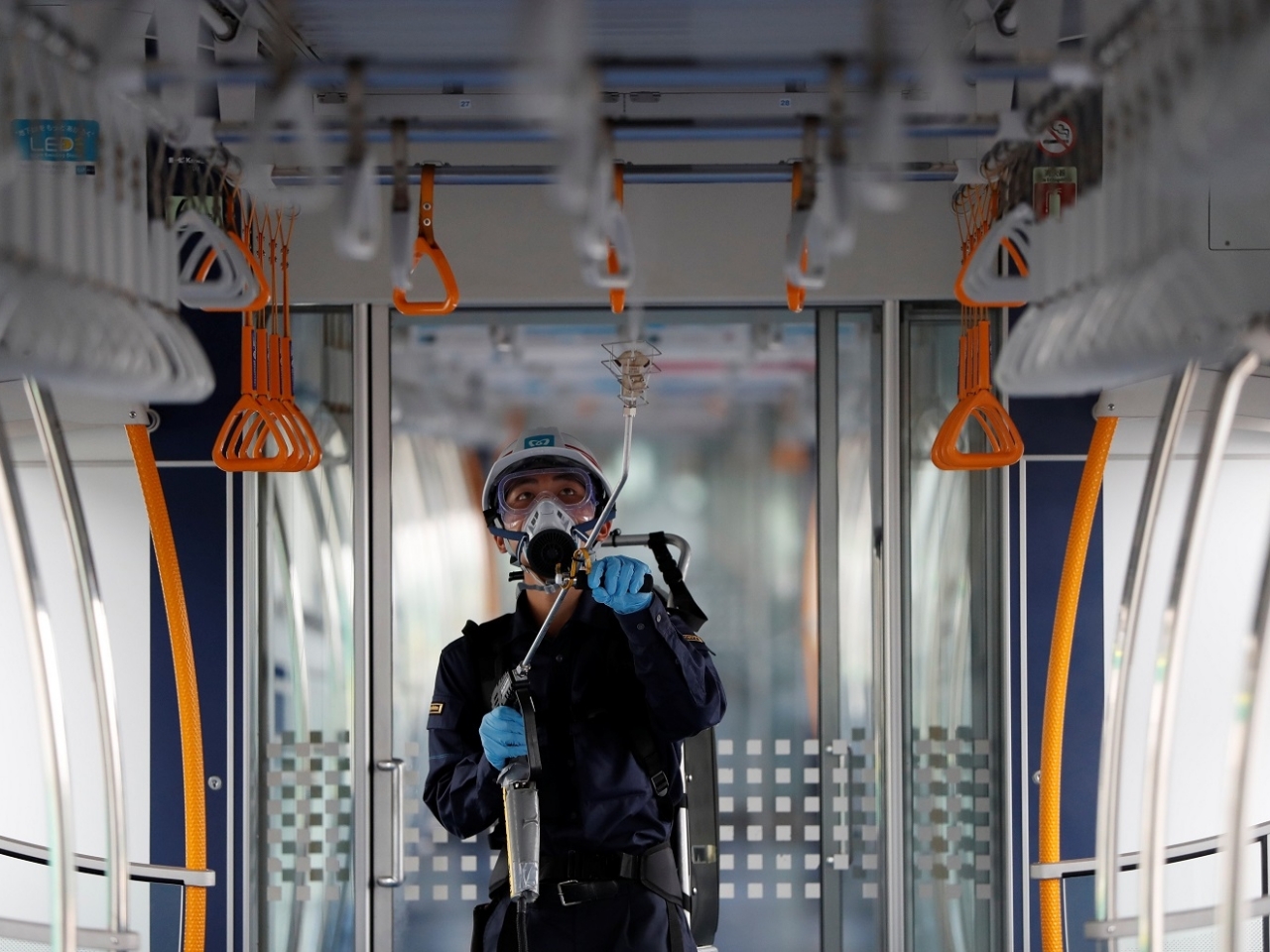 日本鐵路人員在車廂內進行清潔消毒。(路透社)