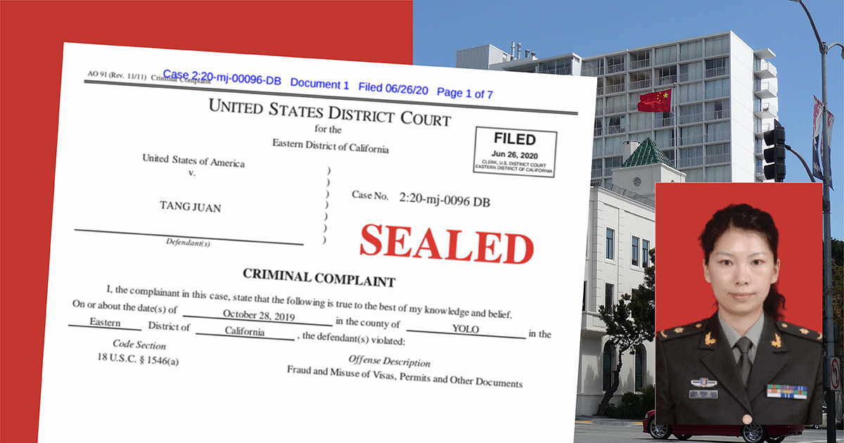 據 Axios 引述聯邦檢察官於 7月 20 日遞交的法庭文件顯示,唐娟以交流訪問學者簽證去美國,於加州大學戴維斯分校從事研究工作。她在申請簽證時,並無披露自己曾效力中國人民解放軍空軍軍醫大學,美方的調查更指,她是現役軍人。FBI 在得到法庭搜令後,在唐娟的住所找到她與解放軍有聯繫的證據。唐娟於 6 月 20 日接受調查人員問話,26日 被指控涉嫌簽證欺詐。