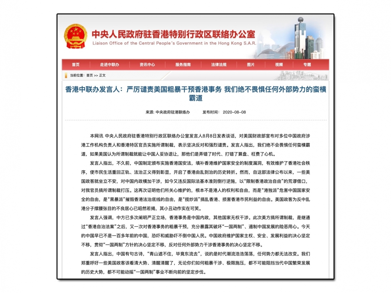 中聯辦發言人說,對於美國宣布對中國政府涉港工作機構負責人和特區官員,實施所謂制裁,表示堅決反對和強烈譴責,絕不會畏懼任何橫蠻霸道,若美國認為所謂制裁能讓中國人妥協退讓,是弄錯了時代、打錯了算盤、枉費了心機。