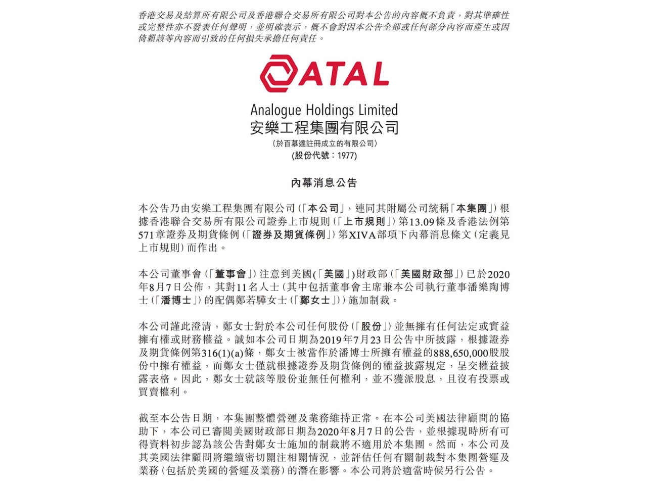 鄭若驊丈夫潘樂陶,以安樂工程集團有限公司主席身份發表內幕消息公告,公司初步認為,美國財政部對鄭若驊的制裁將不適用於該集團,整體營運及業務維持正常,會再評估任何制裁對包括美國的營運及業務的潛在影響。