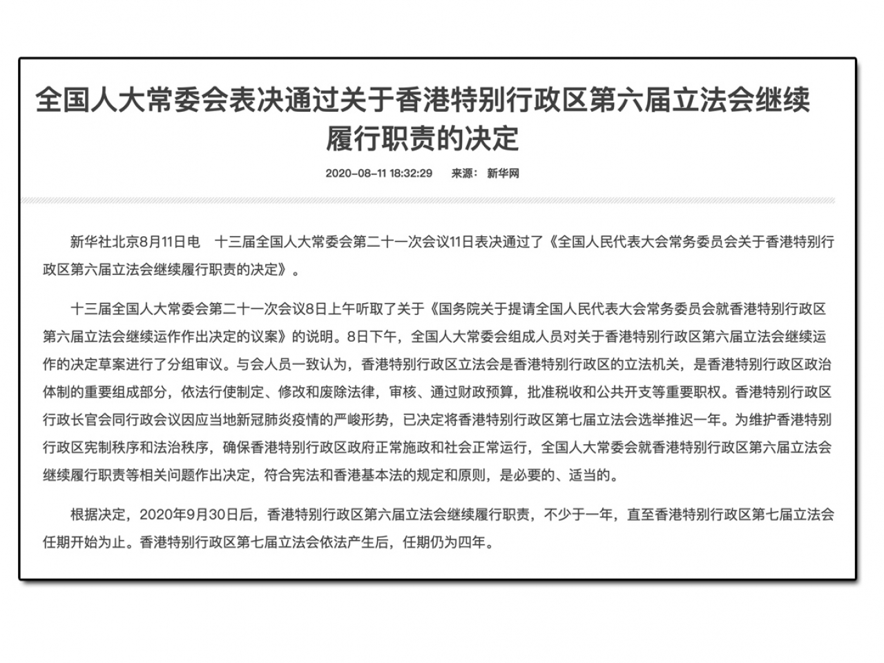 新華社報道,根據決定,由2020年9月30日後,香港特別行政區第六屆立法會繼續履行職責,不少於一年,直至第七屆立法會任期開始為止,第七屆立法會依法產生後,任期仍然是四年。