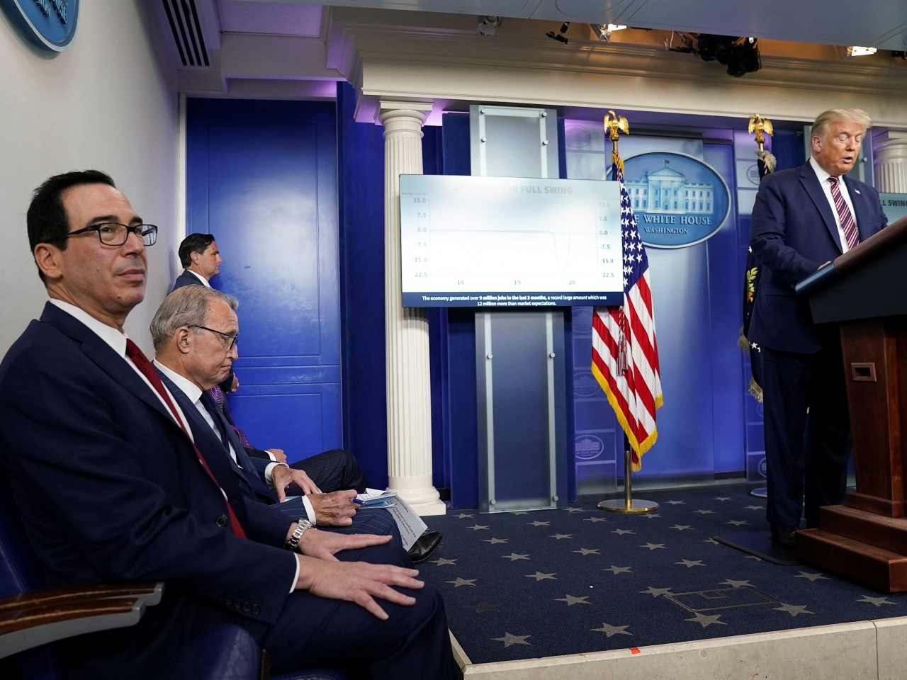 美國財長努欽(左)稱,民主黨人無興趣磋商疫情援助計劃。