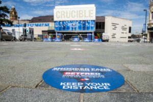“The first part of the process was making sure everyone could get to their seats. There were 226 individually printed and socially distanced dots laid out in Tudor Square at the front of the Crucible, to facilitate the queues before sessions. Lots of professional drawings were done to ensure everything fitted. Exact templates were used to lay out the dots at the appropriate distance.