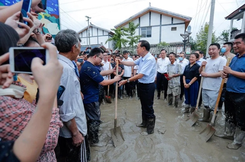 该报道说,双坝村位于涪江沿线,全村8000多人全部受灾,屋内积水最高时达一人多高,村庄周围的农田、蔬菜大棚全部损毁。通稿首段引述李克强对当地干部和随行人员说,要落实好习近平对防汛救灾和灾后重建工作的重要指示精神,确保人民群众的生命财产安全,并询问灾民是否有具体困难,需要哪些政策支持,“党和政府一定会帮助大家度过难关”。通稿显示,当地村民对李克强说,从未见过这么大的洪水,很多在外打工的人都回家来救灾,所幸没有造成人员伤亡。