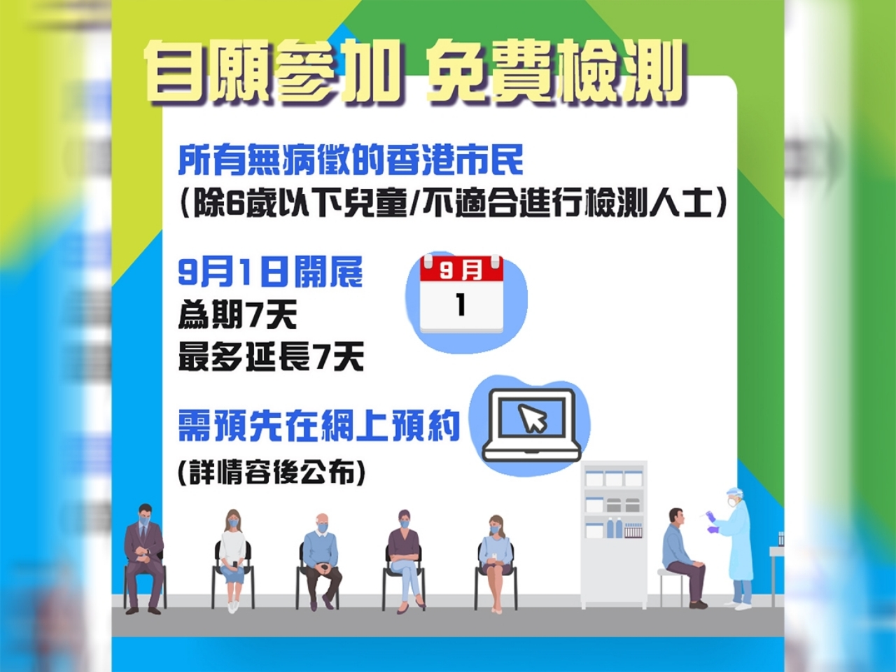 林郑月娥星期五在记者会上宣布,9月1日开始进行“普及社区检测计划”,在全香港18区设超过100个社区检测中心,为市民提供免费病毒检测,筛查出社区的隐形患者,希望能尽快切断传播链。计画为期7至14日,市民下星期起可以在网上预约,由医护人员为自愿参与的市民采样。