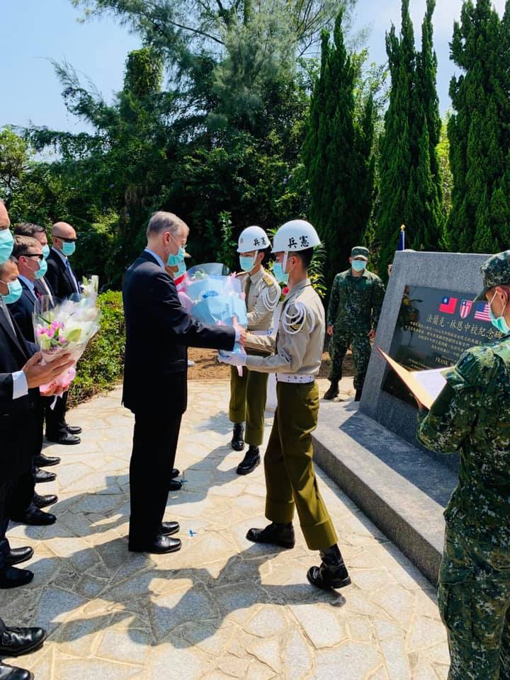 蔡英文在追思仪式上向殉国的将士上香及献花,美国在台协会台北办事处处长郦英杰(William Brent Christensen)也与其他官员站在蔡英文的身后,表达了美国对台湾的支持。向殉职将士献花致意,美国在台协会台北办事处长郦英杰,亦首度出席。