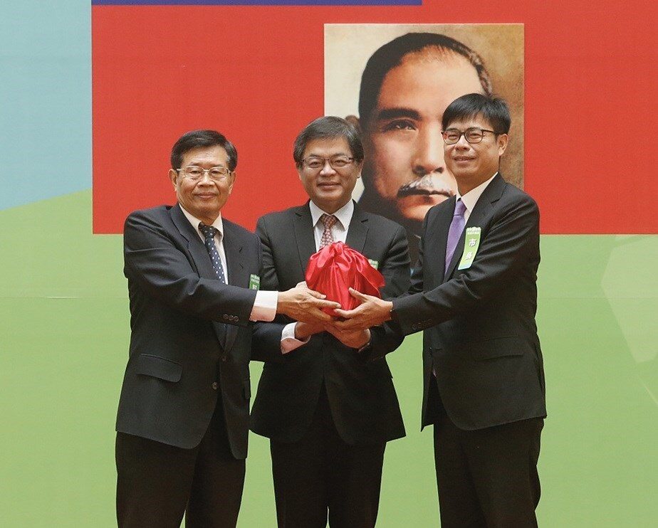陳其邁8月15日以67萬1804票贏得高雄市長補選,上午在高雄市政府四維行政中心舉行宣誓就職暨交接典禮,以「兩年拚四年,高雄大邁進」為主題,完成宣誓就職後,與代理市長楊明州交接印信。