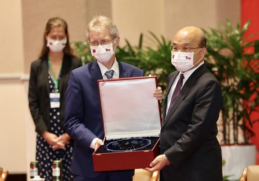 維特齊(Miloš Vystrčil)8月30日率團訪問台灣,蘇貞昌下午在行政院接見維特齊訪團,因應疫情,蘇貞昌和維特齊以擊肘取代握手,也都配戴口罩,蘇貞昌還特別準備捷克品牌的皮爾森歐克啤酒招待訪團。