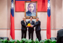 蘇貞昌贈送維特齊台灣造型的木雕工藝品;維特齊則回贈捷克水晶玻璃工藝品。