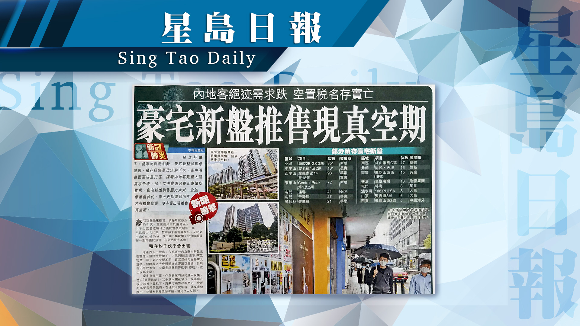 疫情持續下,樓市出現新形勢,豪宅新盤紛暫停推售,積存待售單位涉約千伙,當中港島區更成重災區,隨著內地客數量大減需求急跌,加上立法會通過終止審議空置稅,豪宅新盤銷售壓力大減,急煞停推售步伐,部分更延遲到明年才有機會登場,令市場出現推售真空期。