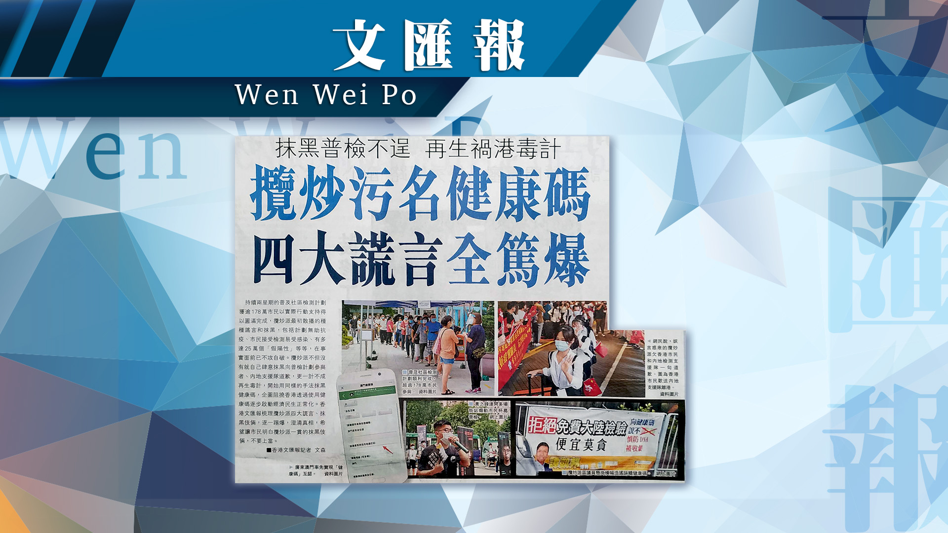 持續兩星期的普及社區檢測計劃獲逾178萬市民以實際行動支持得以圓滿完成,攬炒派最初散播的種種謠言和抹黑,包括計劃無助抗疫、市民接受檢測易受感染、有多達25萬個「假陽性」等等,在事實面前已不攻自破。攬炒派不但沒有就自己肆意抹黑向普檢計劃參與者、內地支援隊道歉,更一計不成再生毒計,開始用同樣的手法抹黑健康碼,企圖阻撓香港透過使用健康碼逐步啟動經濟民生正常化。香港文匯報梳理攬炒派四大謊言、抹黑伎倆,逐一踢爆,澄清真相,希望讓市民明白攬炒派一貫的抹黑伎倆,不要上當。