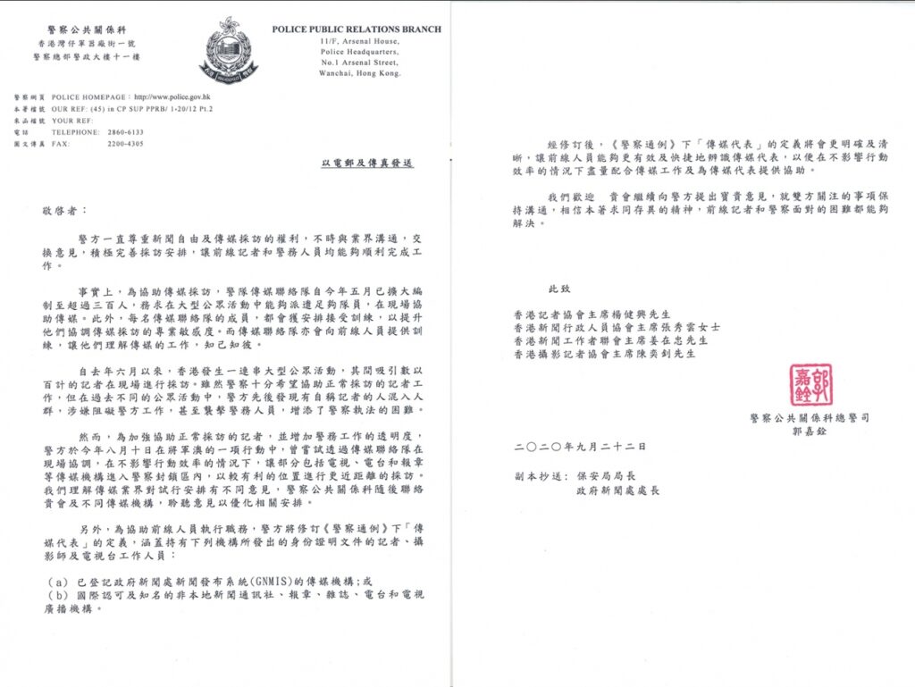 香港警察公共關係科總警司郭嘉銓向四個傳媒組織,包括記者協會、攝影記者協會、新聞行政人員協會等發信,指《警察通例》下傳媒代表的定義,將修訂為已登記政府新聞處新聞發布系統的傳媒機構,以及國際認可及知名的非本地傳媒機構;記者協會及攝影記者協會會員證將不再包括在內。