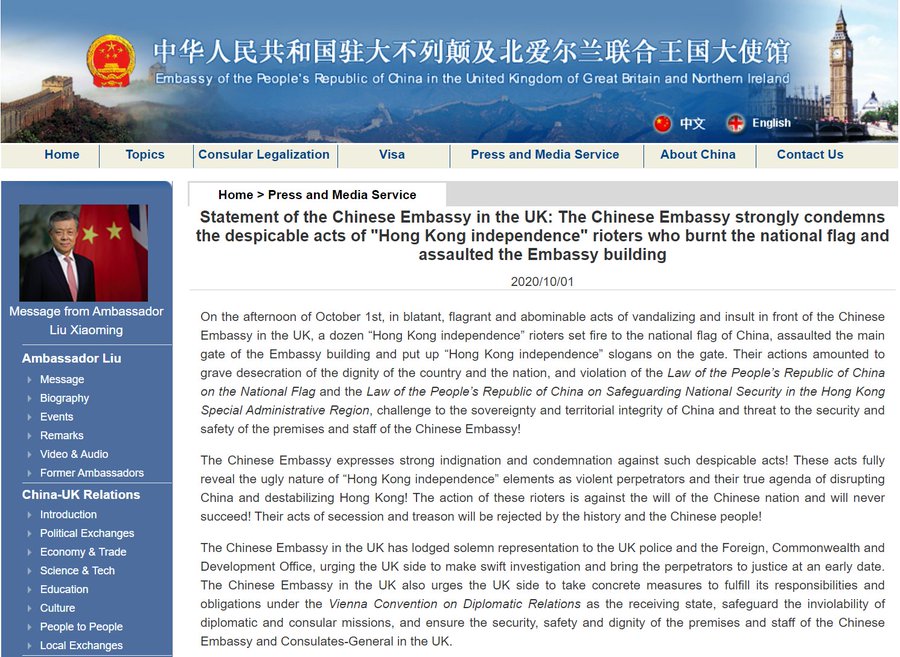 十多名身穿黑衣、头带面罩的香港人于10月1日在伦敦中国大使馆前集会,用粤语和英语高喊“光复香港,时代革命”的口号,并当众焚烧了中国国旗。之后,他们将香港独立旗帜和一面被毁坏的中国国旗插在大使馆正门的铁栅栏上,并张贴标语。
