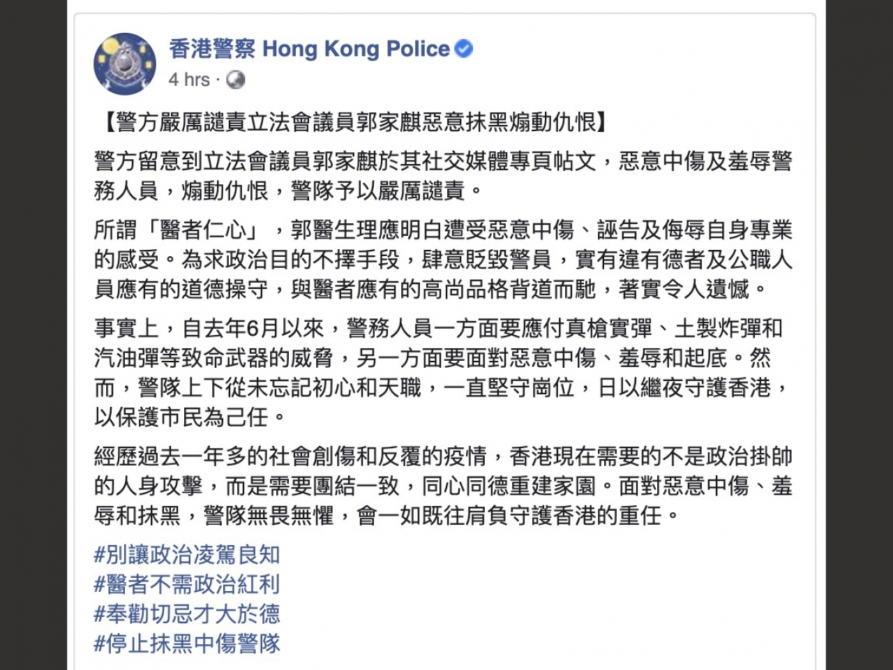 警方在社交網站發文,指留意到立法會議員郭家麒在社交專頁惡意中傷及羞辱警務人員,煽動仇恨,警方對此予以嚴厲譴責。