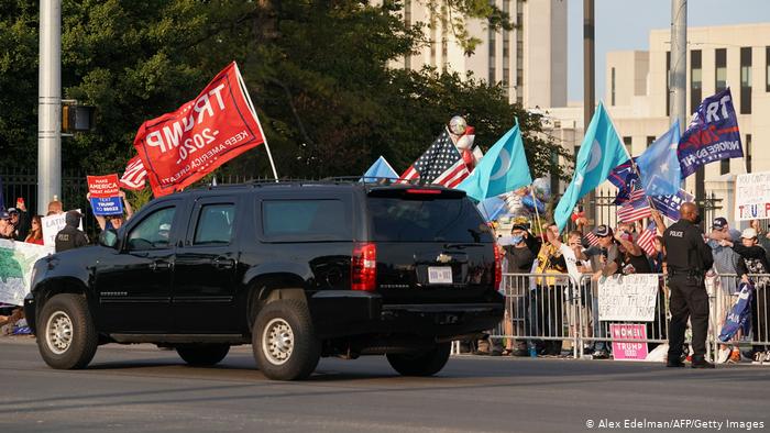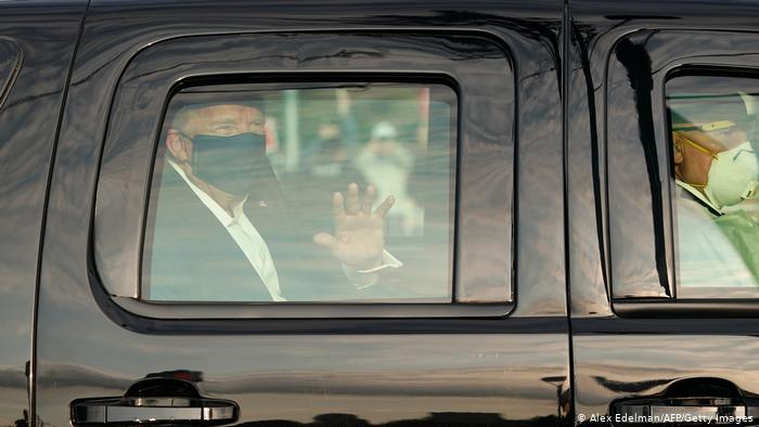 周日(10月4日)特朗普短暂离开国家军事医疗中心,戴着口罩、坐在总统专车内对聚集在医院外的支持者致意,特朗普努力向外界证明他安然无恙,试图破除周末以来对于他的病情前后矛盾的消息。特朗普的医生对他的最新病况表示乐观,并暗示他可能周一(10月5日)出院。