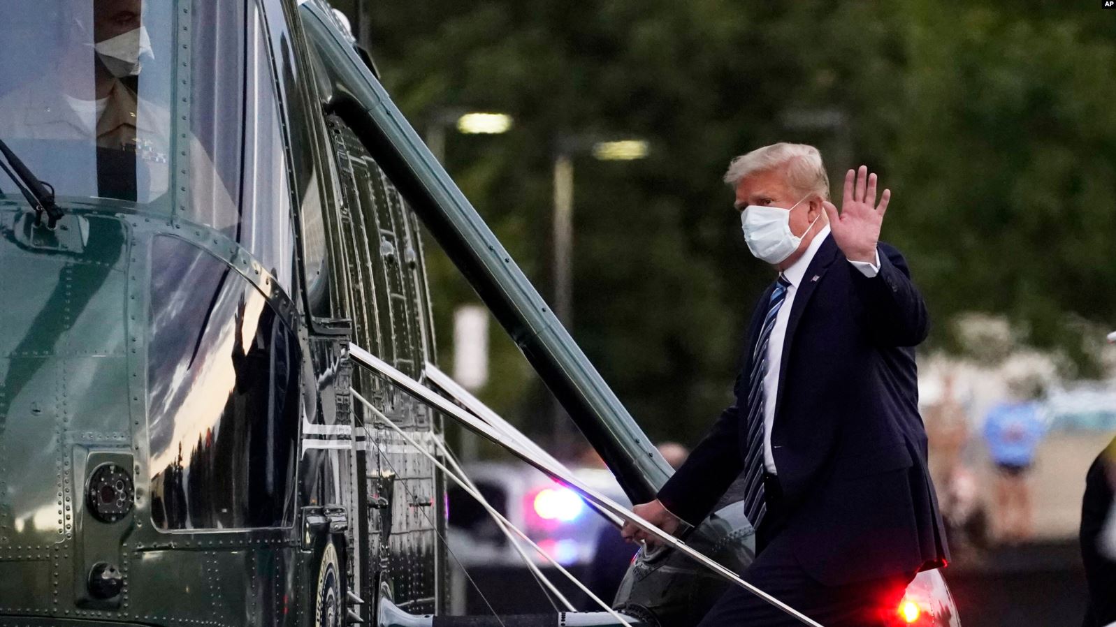 特朗普走下直升机走向白宫住所时,短暂停步转向摄像机,挥了挥手并竖起大拇指。美国之音问他感觉如何,依稀听到“挺好”的回答。