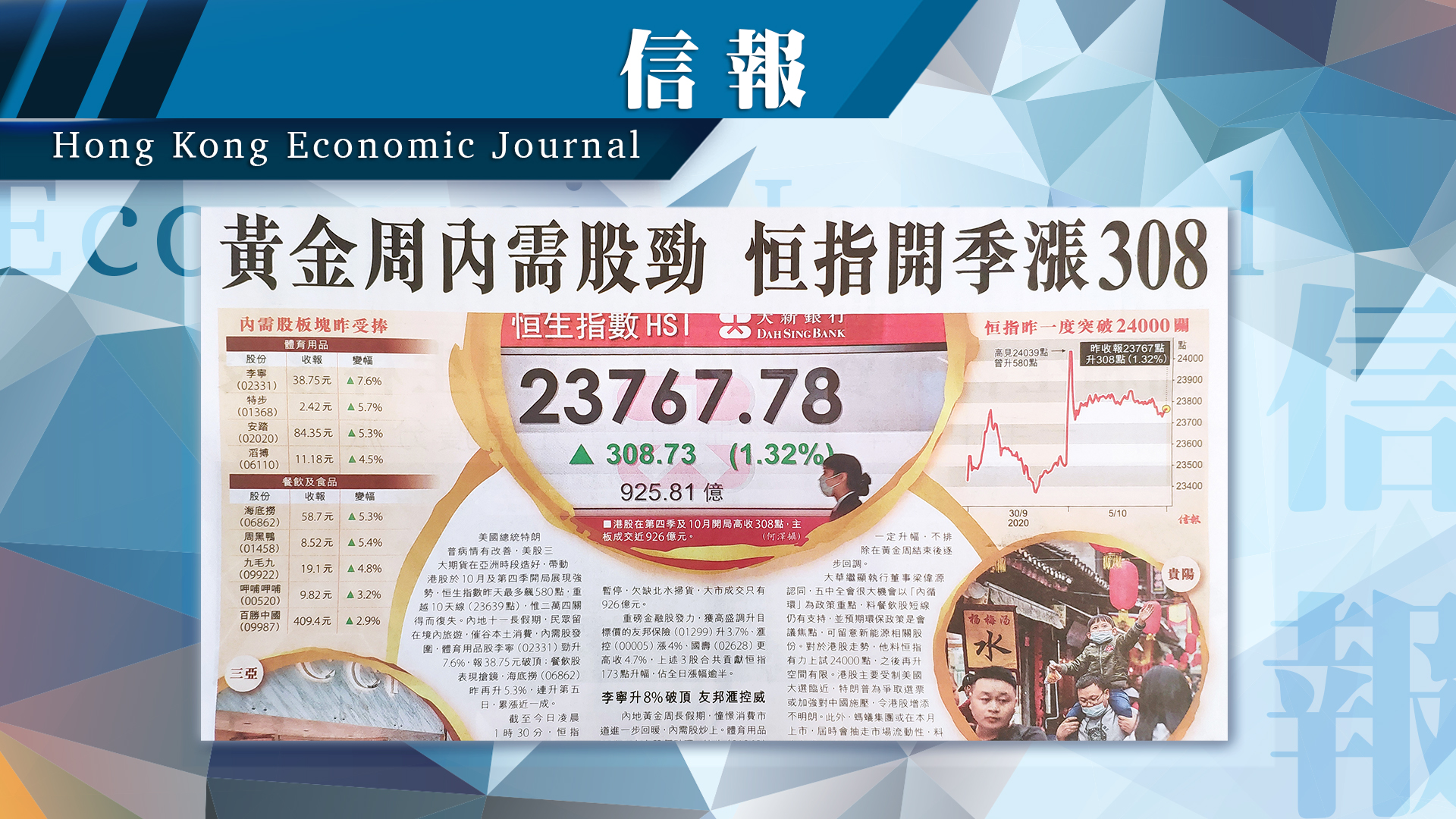 《信報》﹣ 黃金周內需股勁 恒指開季漲308