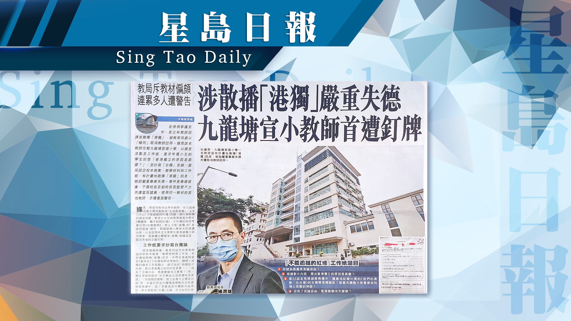 《星島日報》﹣ 教局斥教材偏頗 連累多人遭警告 涉散播「港獨」嚴重失德 九龍塘宣小教師首遭釘牌