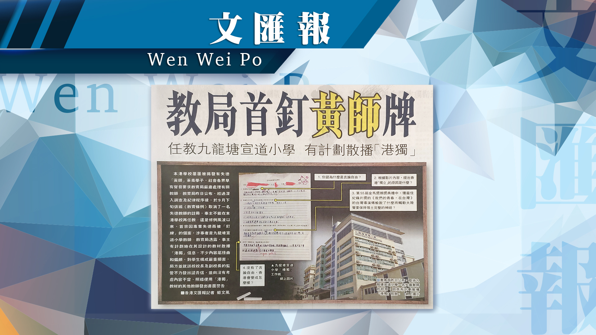 《文匯報》﹣ 教局首釘「黃師」牌 任教九龍塘宣道小學