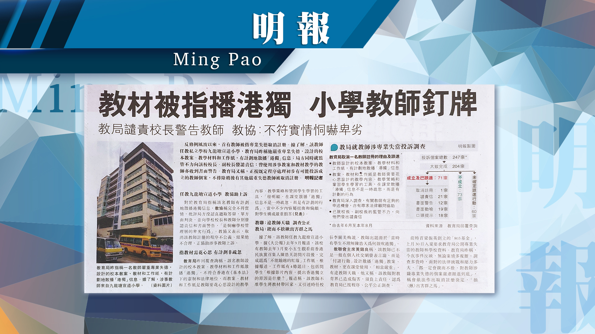 《明報》﹣ 教材被指播港獨 小學教師釘牌 教局譴責校長警告教師 教協:不符實情恫嚇卑劣
