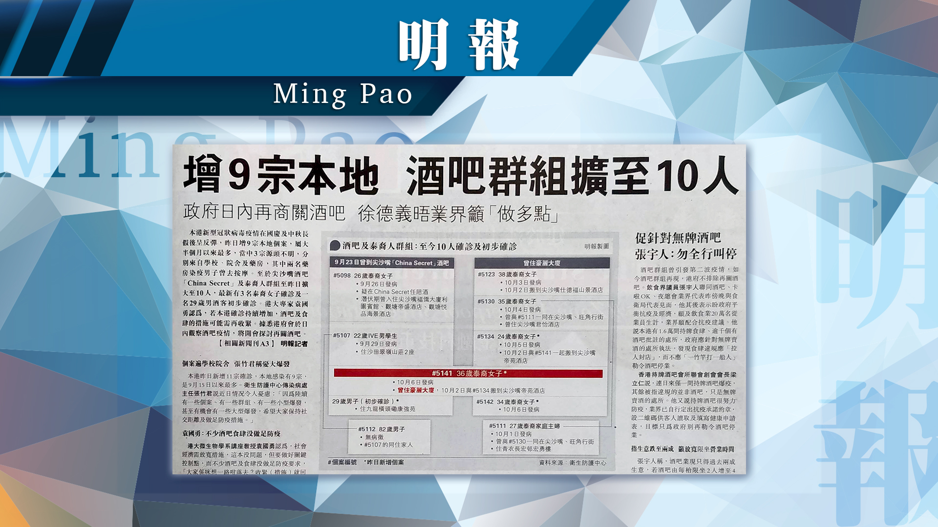 《明報》﹣ 增9宗本地 酒吧群組擴至10人 政府日內再商關酒吧 徐德義晤業界籲「做多點」