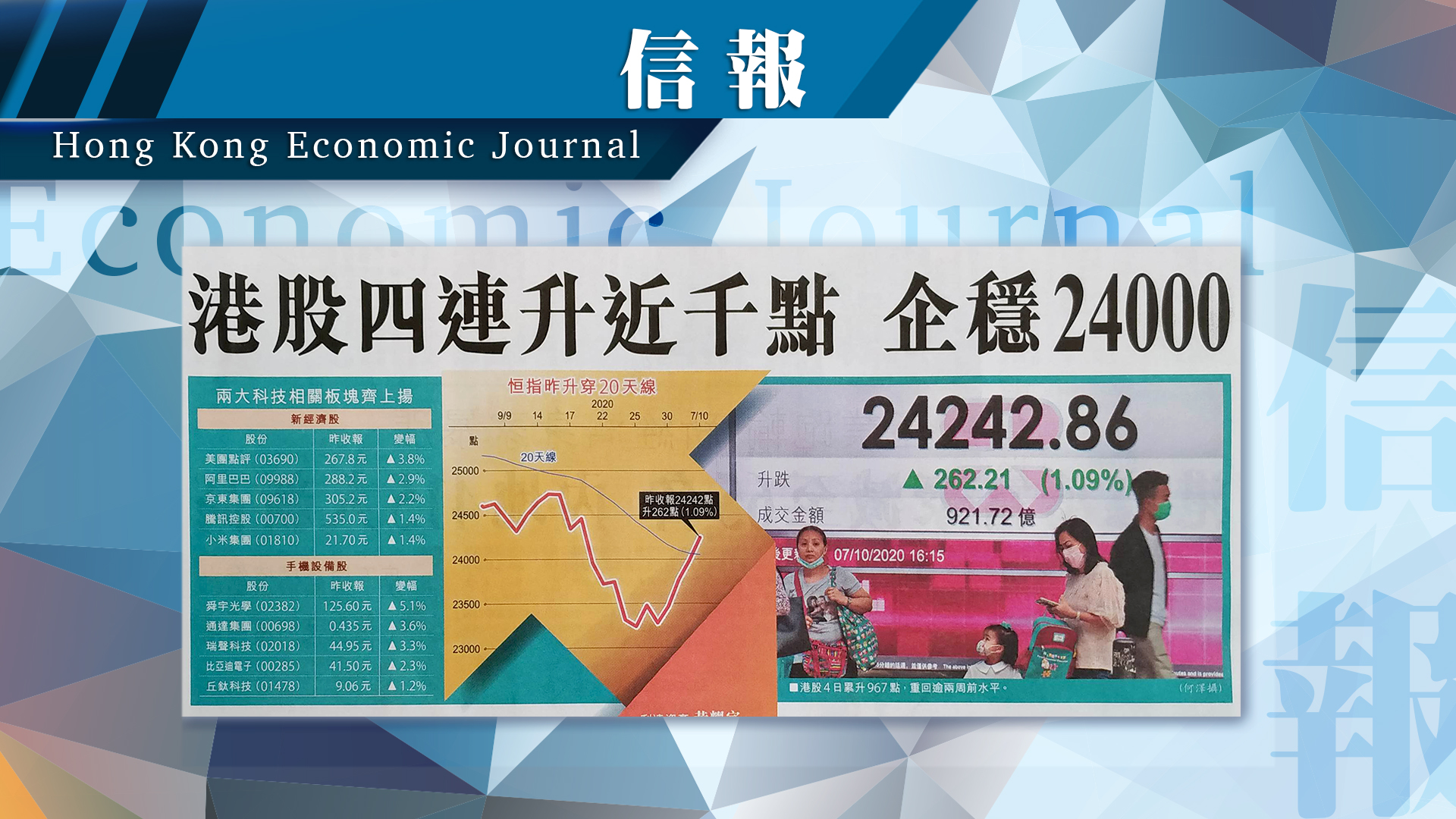 港股延續強勢,在科技股帶領下,昨再升超過兩百點,以接近全日高位收市。恒指連升4個交易日,累漲967點(4.16%),為7月初以來最長連升紀錄,技術走勢進一步轉好,升穿20天線(24048點),並企穩兩萬四關以上收市。恒生科技指數升勢更凌厲,昨漲158點(2.16%),收報7494點,同樣四連揚,累升517點(7.4%)。