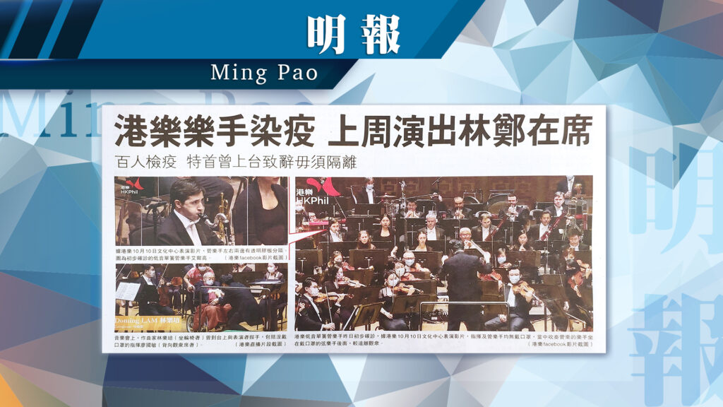 《明報》﹣ 港樂樂手染疫 上周演出林鄭在席 百人檢疫 特首曾上台致辭毋須隔離