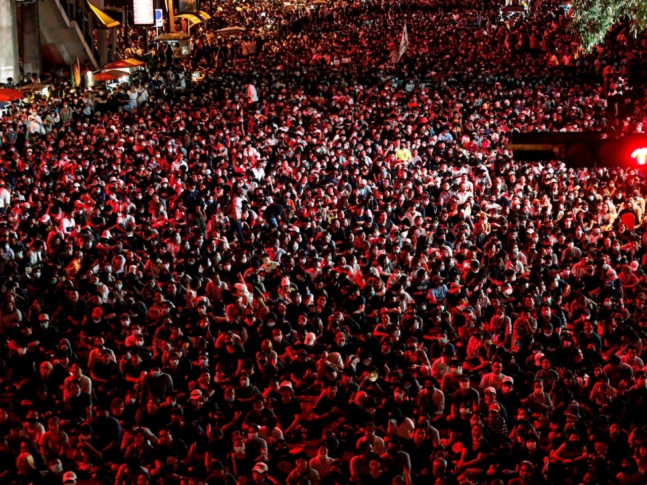 泰國曼谷晚上有數以千計反政府示威者,不理會當局實施的緊急法,在市中心聚集,要求總理巴育落台。