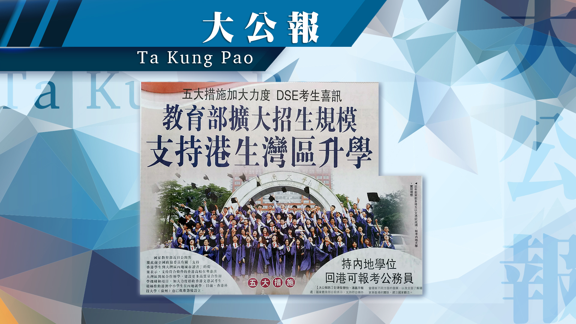 國家教育部近日公開答覆此前全國政協委員有關 「支持香港學生到大灣區內地城市讀書」 的提案表示,支持符合條件的香港高校在粵港澳大灣區開展合作辦學,建設更多高質量合作辦學機構和項目,加大力度招收香港文憑試考生,積極推動港澳中小學生在內地就學。目前,香港科技大學(廣州)也已批准籌備設立。
