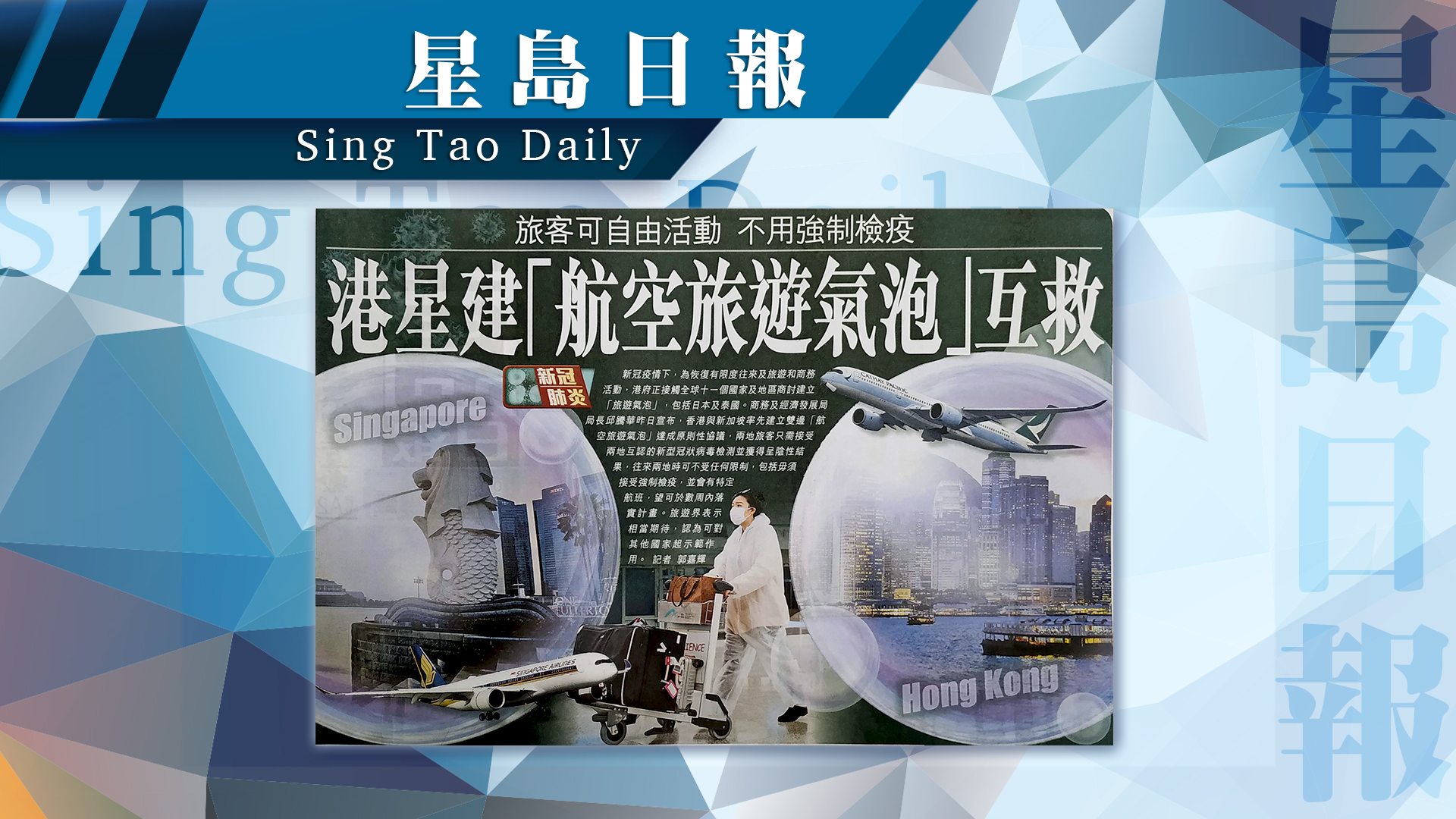 香港與新加坡就建立雙邊「航空旅遊氣泡」達成原則性協議,參與「氣泡」的香港與新加坡人士必須接受兩地互認的新冠肺炎病毒測試陰性結果,且必須乘搭特定航班往來,便可獲免除強制性檢疫或居家通知情況下,在目的地自由經商或旅遊,最快數周後落實計劃。旅發局回應表示,已準備就緒推出機票及酒店等促銷優惠,吸引旅客歸來。旅遊業界則認為,這是重啟旅遊業的第一步,能否受歡迎還看檢測安排及費用,倘檢測費仍要上千元,勢必削弱吸引力。