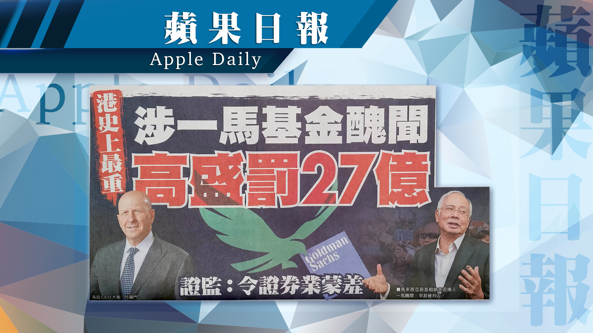 《蘋果日報》﹣ 港史上最重 涉一馬基金醜聞 高盛罰27億 證監:令證券業蒙羞
