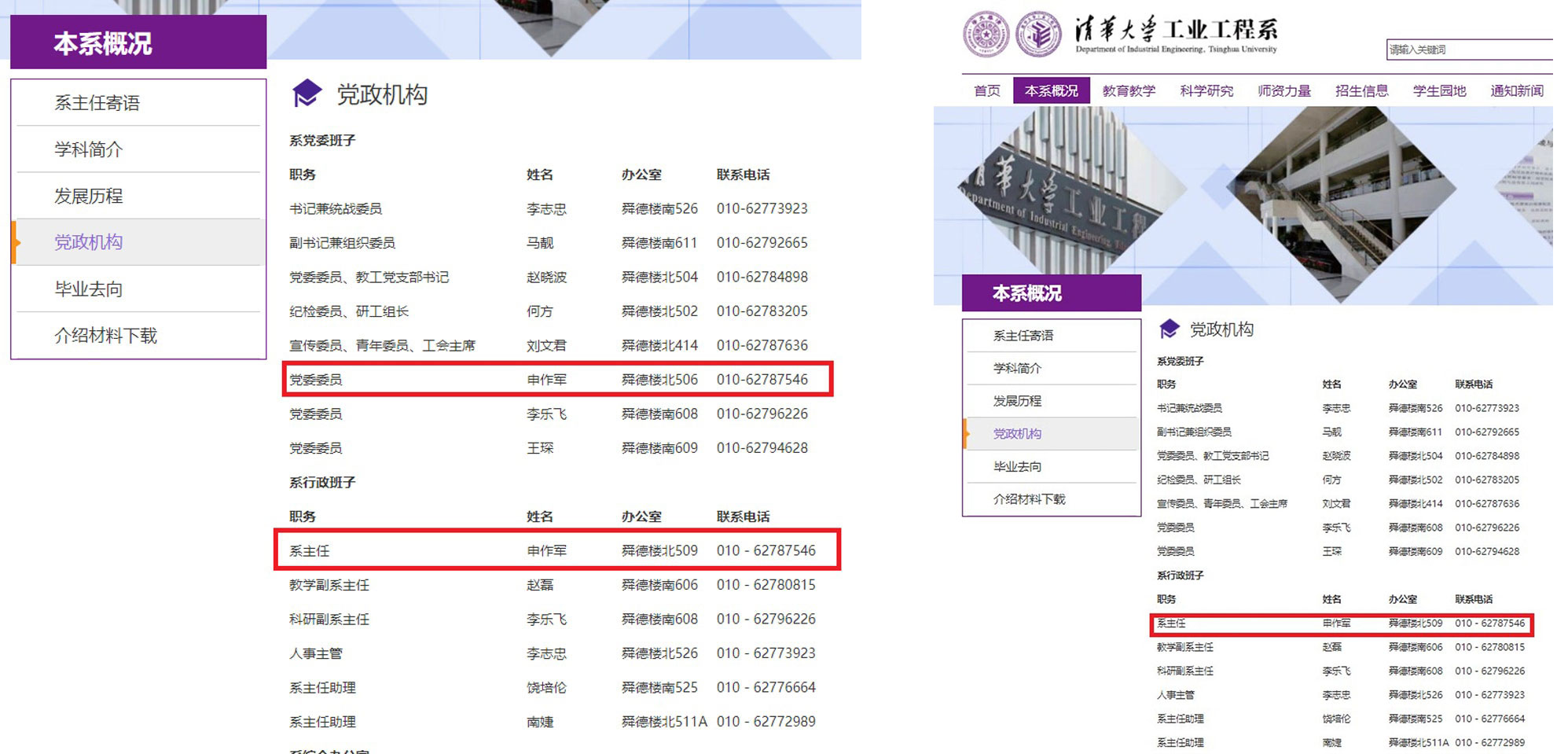 查清华大学资料,发现网站曾遭删改,10月23日前的网站记录显示,其中一位会获委任为港大副校长的申作军,他的名字出现在“党政机构”一栏的“系党委班子”及“系行政班子”,到10月23日,申作军的名字就被调到“系行政班子”,意味申作军既是该学系的系主任,亦曾为系党委的党委委员。