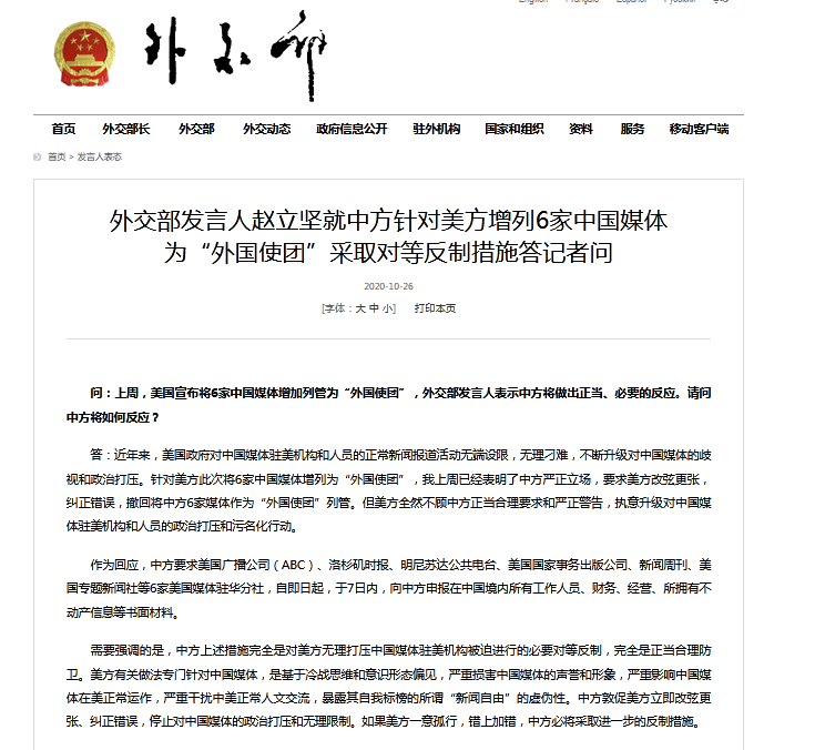 中国外交部宣布对等反制,6间驻华美媒须申报人事及财务纪录。这6间媒体分别是美国广播公司(ABC)、洛杉矶时报、明尼苏达公共电台、美国国家事务出版公司、新闻周刊、美国专题新闻社。