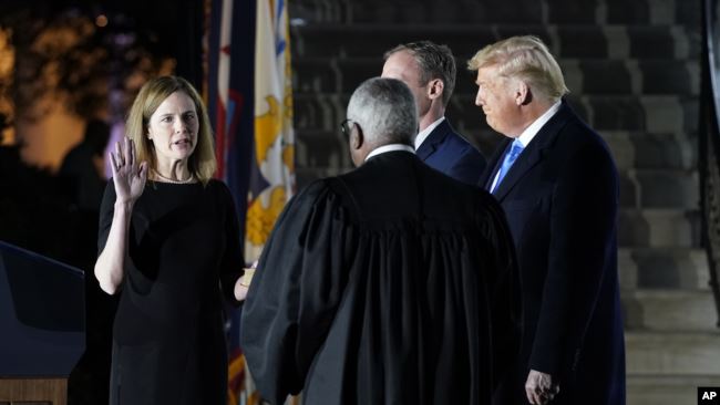 美国国会参议院星期一(10月26日)晚以52票对48票批准联邦上诉法院法官艾米·康尼·巴雷特(Amy Coney Barrett)出任美国最高法院大法官,随后不久,巴雷特在白宫宣誓就职。