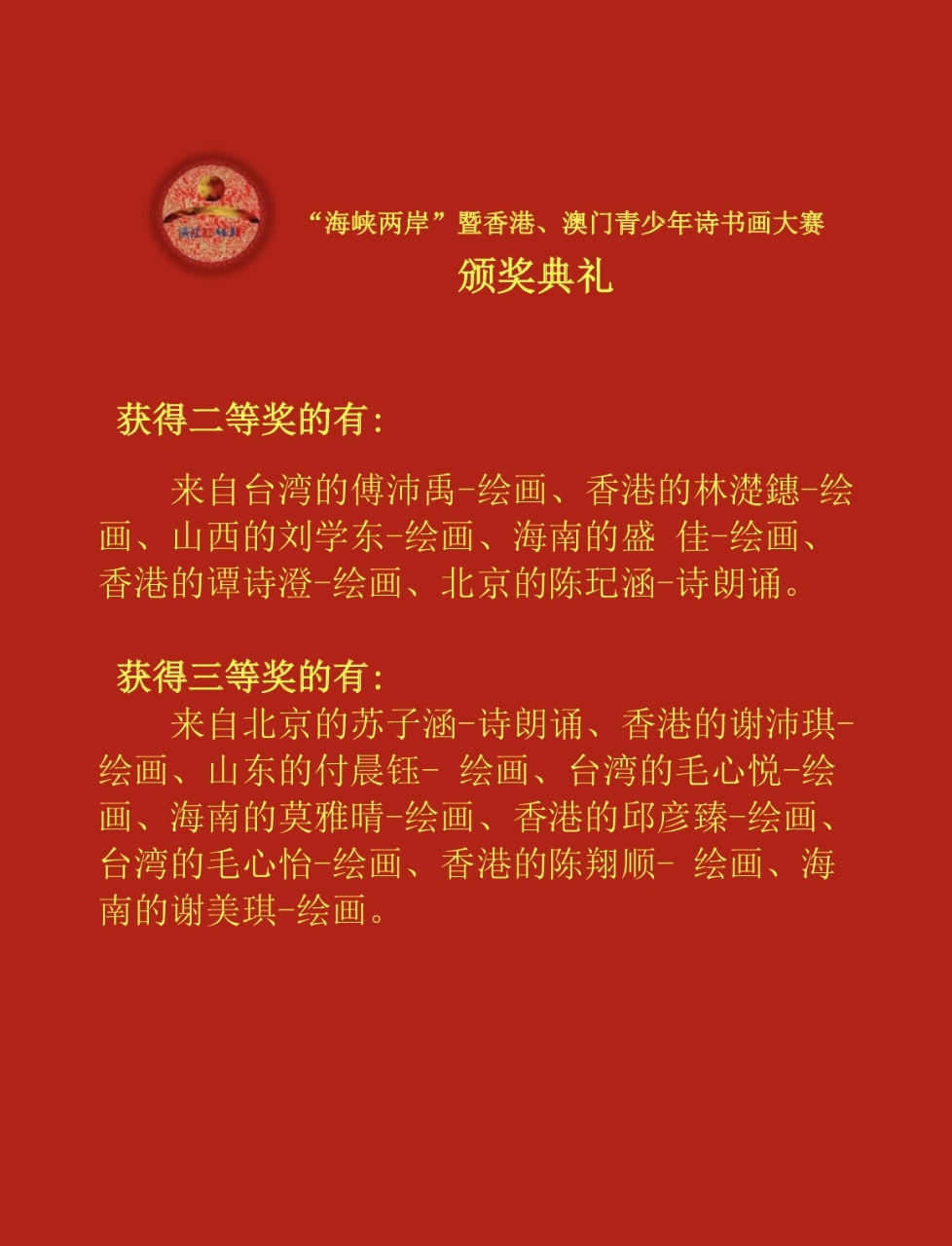 荣登本次大赛榜首的特等奖是来自澳门特区的关星陆-软笔书法。 荣获一等奖的有: 北京的李金睿-朗诵 香港的陈颖熙-绘画 海南的陈思琪 -绘画 澳门的杨潼熙-书法 本次大赛,青少年朋友们以原创诗、诗朗诵抒怀,以绘画畅想,以书法传情,唱响了未来的昂歌,描绘了世界的美好愿望,把十月的秋色染得斑斓绚丽。