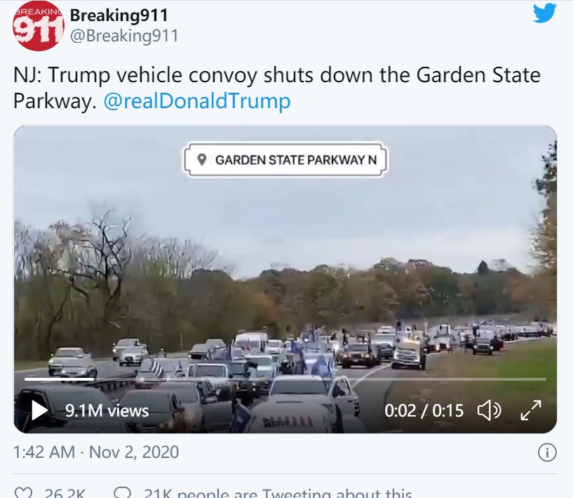 與此同時,推特上也出現多則貼文,顯示新澤西州花園州大道(Garden State Parkway)今天下午車流嚴重回堵景象,據說也是由支持川普的駕駛所為。